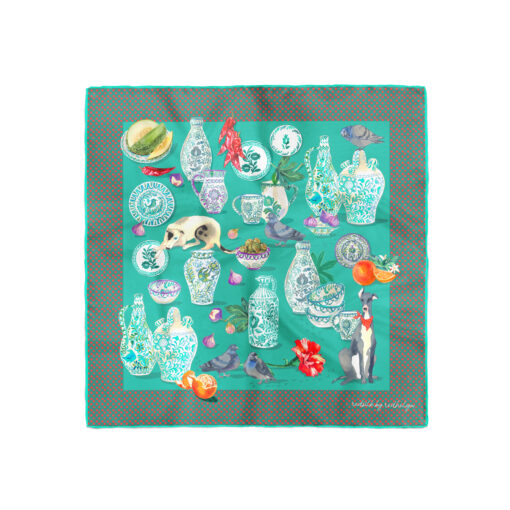 Vivid tones of water green , reds splashed across this silk scarf.